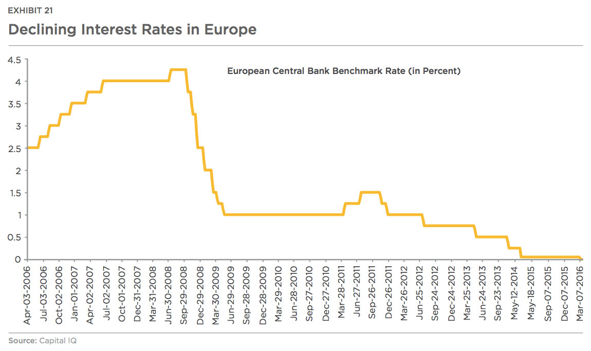 Market risk is the risk of loss caused due to adverse movements in interest rate, equity, property, credit spread, market concentration and currency risks after adjusting for diversification levels. With prolonged low interest rate environment as reflected in Exhibit 21, earning sufficient return on reinvestments (fixed income, primarily, which forms the majority of the insurers' investment portfolio) is getting difficult. Reducing duration mismatch and proper hedging practices are on top of executives' mind to control or reduce the market risks arising out of investments in financial instruments.