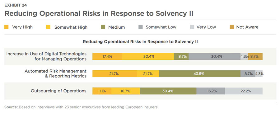 Operational risk, for capital purposes, is defined as the risk of loss from inadequate or failed internal processes, people, and systems or from external events. To reduce risk arising from such failures, organizations need to record and assess their risk frameworks, including processes, risks, events, key risk indicators (KRI) and controls. Through dashboards and reports that highlight key risk metrics such as Value at Risk and policy compliance, executives can stay on top of organizational risk activities. Companies must employ business process automation capabilities that provide for real-time event escalation, automated risk processes, and efficient remediation of problems and action items. In addition, outsourcing of operations such as claims processing and managing policy servicing and policy issuance are being focused on in order to reduce operational risks. Insurers should have a business continuity and crisis management framework (including for outsourcing vendors) which strives to protect critical business functions from the above mentioned failures and enables them to carry out core tasks on time and in compliance with the highest standards. This framework should be embedded within the overall risk management process. Firms should also work on a cyber and information security program on an ongoing basis, in order to better respond to current external developments and to further strengthen the internal control environment around related operational risks. Exhibit 24 lists the priorities of EU insurance firms to tackle operational risks.