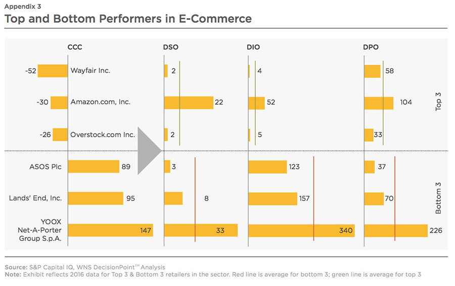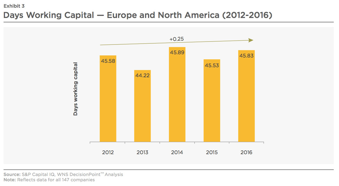 A WNS DecisionPoint™ analysis shows that from 2012-2016, the top 147 retailers in North America and Europe were unable to make sustainable improvements in working capital efficiency. During this period, the industry showed a decline of 0.25 days. However, the Cash Conversion Cycle (CCC) for sectors such as apparel, drug retail, food, hypermarkets, supercenters and general merchandise stores had improved significantly. On the other hand, the CCC for electronics, home improvement and furnishings, and specialty stores had deteriorated.
