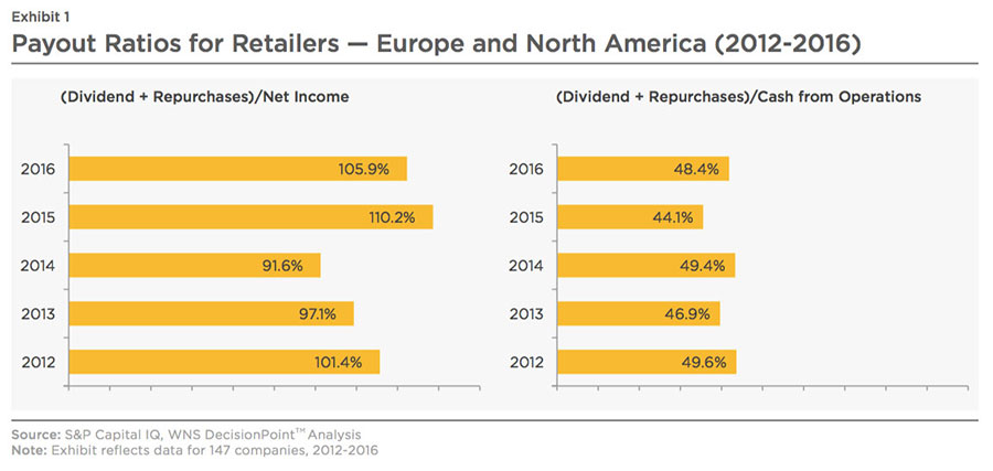 Companies primarily reward their shareholders in two primary ways dividend payments and stock repurchases. These payouts are important to keep the share prices buoyant because growth opportunities (another share price driver) are limited in the physical retail sector due to high maturity and saturation. Buybacks, often at indiscriminate prices, are used to demonstrate to the Street that the stock is undervalued, while stocks with high dividend yield attract risk-averse investors when bond yields are low. To analyze these payouts and the corresponding funding required to support them (Exhibit 1), WNS DecisionPoint™ studied the data of the top 147 retailers (by revenue) in North America and Europe. Our findings show that the payouts have grown by 3.1 percent annually during the last five years dividend payments grew by 5 percent and repurchases 1.8 percent.